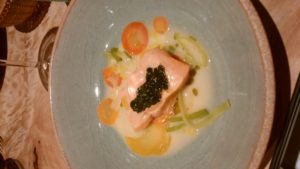 (野性の遺伝子を持つ鱒を選抜して放流し、川に返ってきたスチールヘッドを酸味のきいたクリームとバジルのソースで。ニンジンとリーキはshofarmのものです。ちなみに野性、原種は原川さんが大好きなキーワード。)